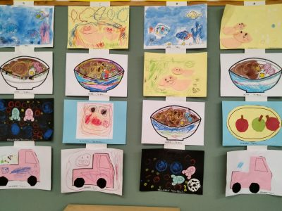 只今恵み野第二幼稚園のおへやには、作品展の作品が飾られています。