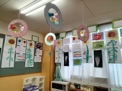 4月から描いてきた絵や製作物など子どもたちの頑張りが色々な形で表現され、おへやはとても賑やかですよ!