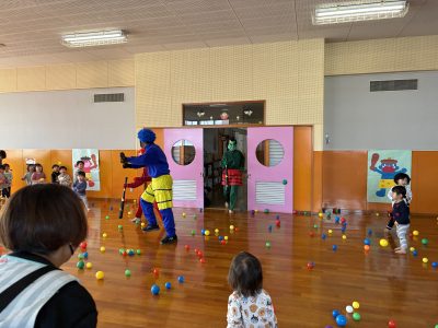 0歳~2歳児クラスは、当日ホールで鬼退治の練習!カラーボールを投げて準備OK